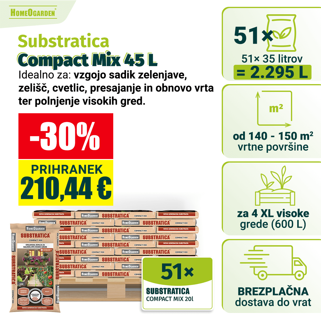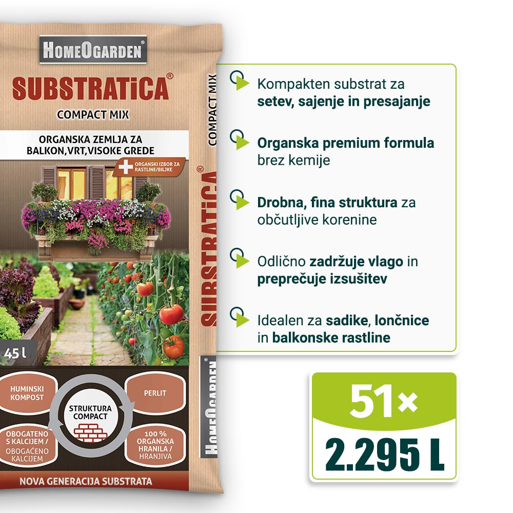 Substratica Compact Mix 45 l je zemlja za rože nove generacije, zasnovana za uporabo v majhnih prostorih, kot so balkoni, terase in lonci. Vsebuje huminski kompost, ki revitalizira tla in povečuje aktivnost koristnih mikroorganizmov, ter organske hranilne dodatke za optimalno rast.