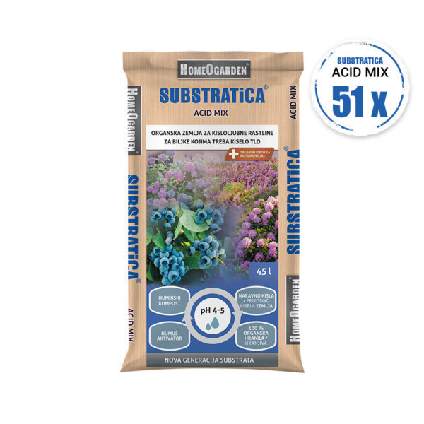 Substrat za borovnice Substratica Acid Mix je posebej zasnovan substrat za rastline, ki uspevajo v kislih tleh. Zaradi optimalne pH-vrednosti (4–5) zagotavlja rastlinam odlično osnovo za ukoreninjenje ter pospešuje njihovo rast in obilen pridelek. Substrat vsebuje huminski kompost, belo in črno šoto ter organsko gnojilo z mikrohranili, ki zagotavlja, da rastline dobijo vse potrebne elemente za zdravo rast. Pridobljen je iz naravnih snovi brez umetnih gnojil ali agrokemikalij.